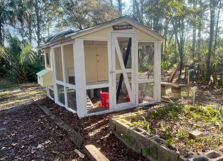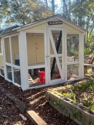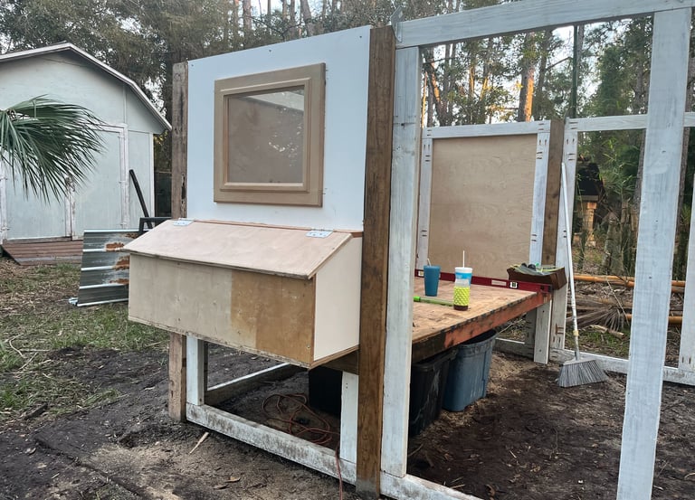 I found 35 rotting 2x4s in the back of the house. This is Florida so untreated wood doesn't last long, about a quarter of them were crumbling, but the rest I brushed off and coated with some Killz and even though not a single one was straight they worked out to build this coop. We were able to scrounge up most of the other parts from spare panels we have from our cabinet business. The window is a glass cabinet door. We did buy about a $100 in OSB (really low quality plywood) and brackets for the roof for the roof and the part of the front to the coop. He pre-drilled a lot of the screw holes. We also had a box of free screws from a friend who was getting rid of stuff.