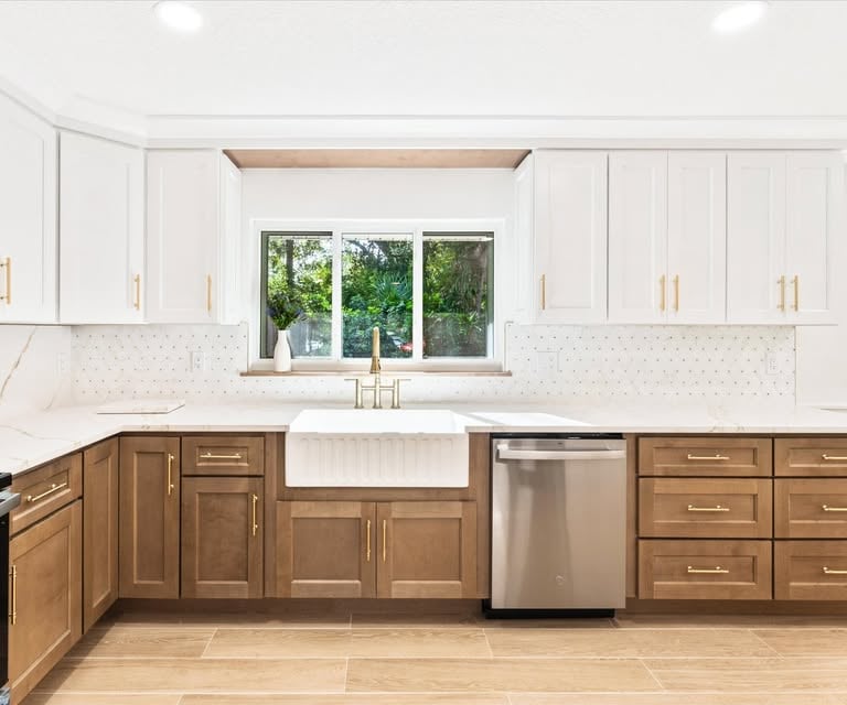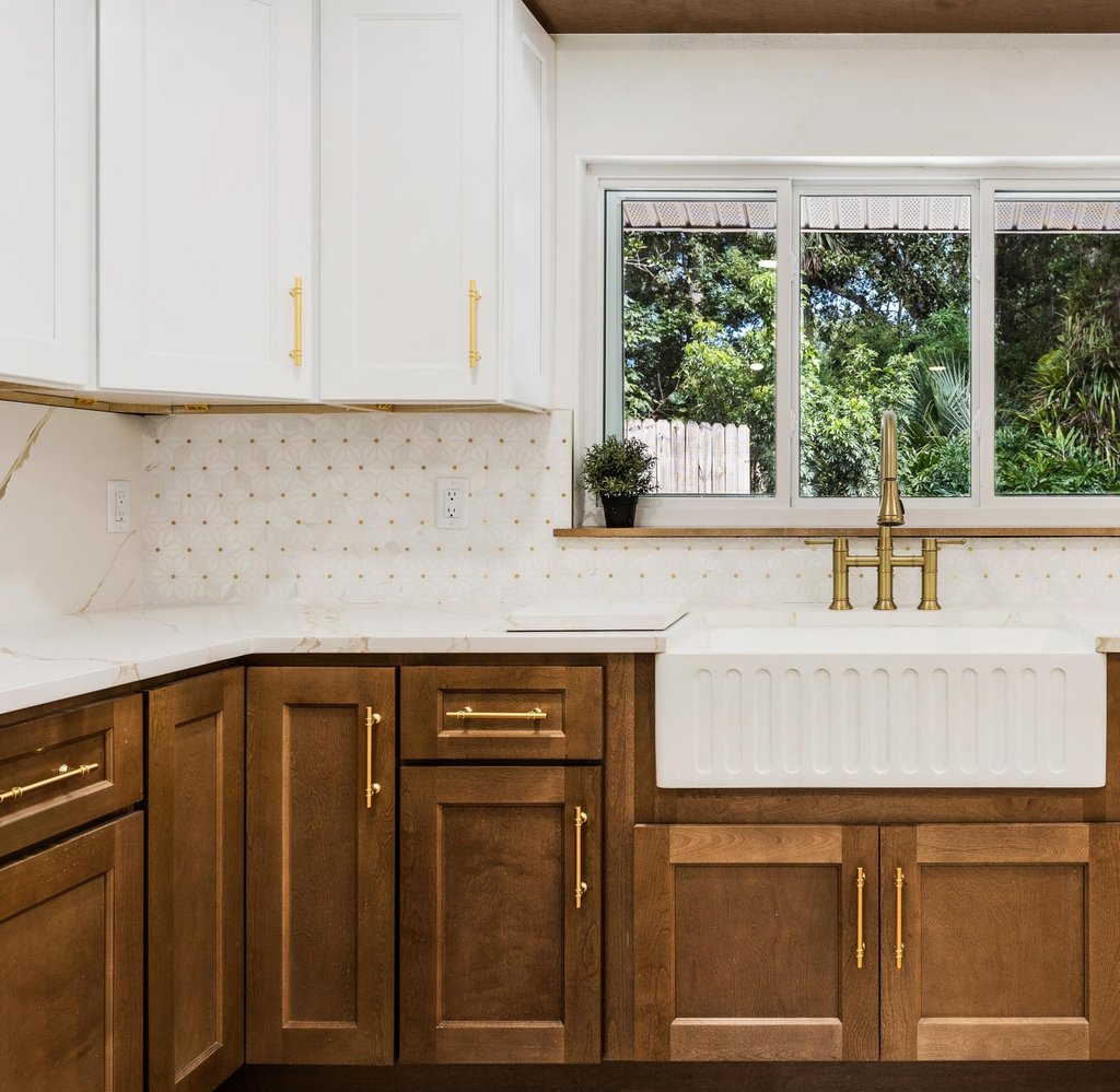 The first thing I did is keep a very simple neutral palette. I just wanted to provide a beautiful blank slate for potential buyers. Wood, white and gold. The kitchen before this was an all-white and I really liked that kitchen, but I wanted to switch it up with a dark cabinet, but I quickly realized with only one south facing window I needed all the light I could get. So, the very attractive compromise was a two-tone kitchen. Brooklyn Fawn from KCD a shaker style base cabinets and Brooklyn White also from KCD a shaker style wall cabinet. Which really feels a lot more grounded than all white to me.