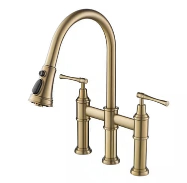 This gold hardware is really inexpensive I think it was $50 for a ten pack of 5-inch handles. They just keep up with the sparkly that this kitchen presents as. And a gold bridge faucet. It has a useful pull-down feature and it adds a little character that goes well with a farmhouse sink.